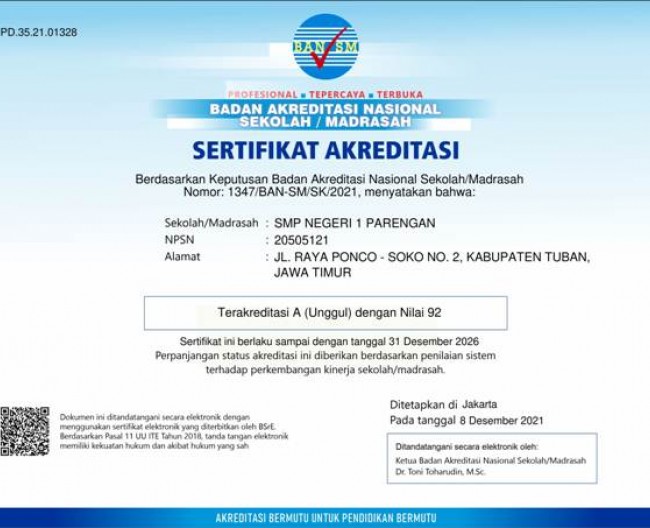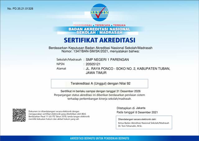SERTIFIKAT PERPANJANGAN AKREDITASI SMP NEGERI 1 PARENGAN TAHUN 2021-2026
